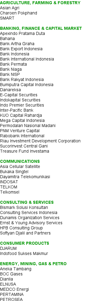 | MANUFACTURING & PROCESS Argha Karya Prima Industry APAC Citra Centertex APAC Inti Corpora BAKRIE Pipe Industries Dharma Polimetal Ever Shine Tex Krakatau Steel Lautan Luas Polyprima Putra Dharma Harmoteknik RASICO Industry Sapta Indra Sejati Semen Gresik United Tractors Pandu Engineering INFRASTRUCTURE, PROPERTY & RELATED SERVICES Agung AutoMall Bumi Sarana Utama Cipta Marga Nusaphala Persada (CMNP) Jakarta Setiabudi International Indonesia Jasa Marga Kawasan Industri Makassar IT & SOLUTION Aplikanusa Lintasarta Global Pratamasis Netsindo Pratesis SCS - Astra Graphia Technologies SECCOM Networks LOGISTIC AND RELATED SERVICES Cardig International LINFOX Logistics Indonesia Samudra Indonesia MNC, MULTI-INDUSTRIES & CONGLOMERATES Hadji Kalla Group Humpuss Siemens PUBLIC SECTOR & UTILITIES Election Committee - KPU Pasar Jaya PD PLN - Pembangkit Jawa Bali Perusahaan Gas Negara PINDAD Thames PAM Jaya TRAVEL, TRANSPORTATION & RELATED SERVICES Angkasa Pura 2 ASTRA Rent a Car |